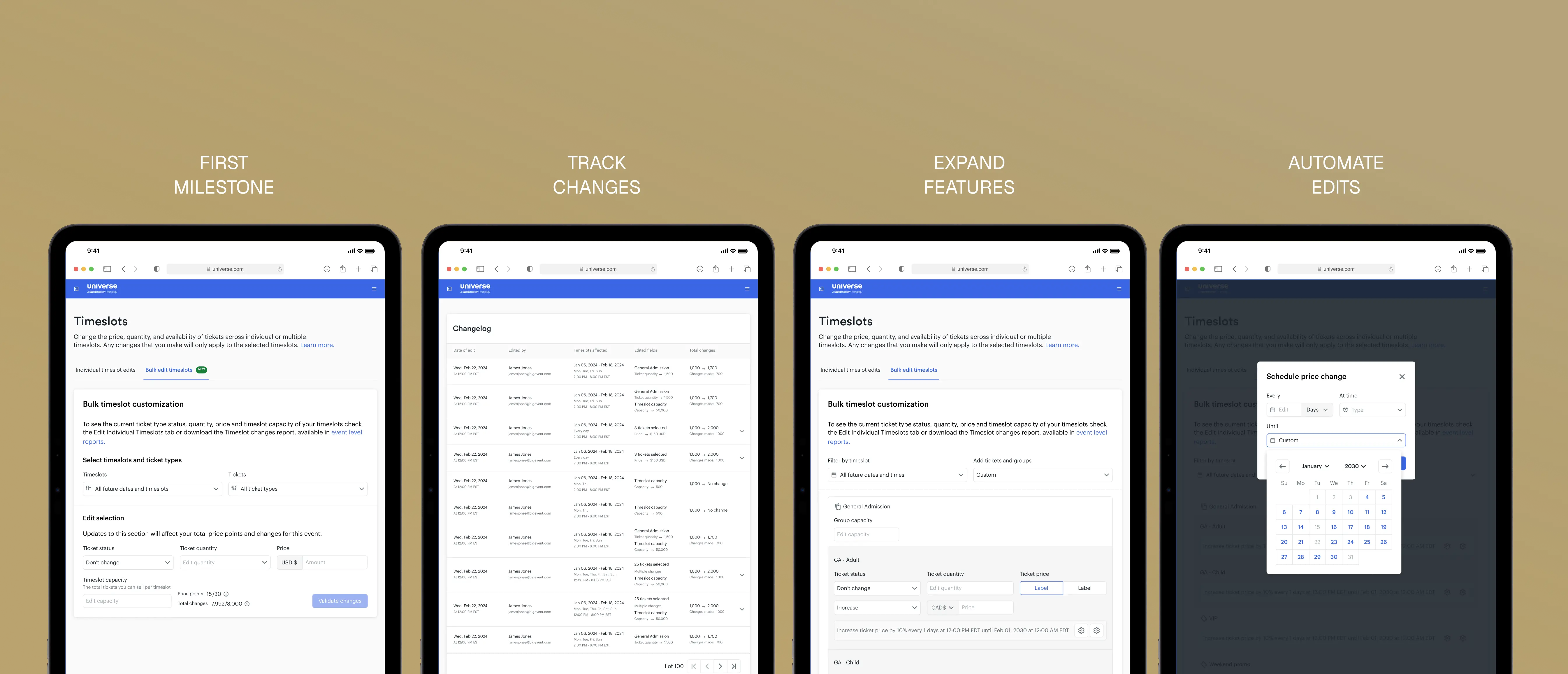 Launched a focused first version that enabled consistent edits across tickets and timeslots, then added change tracking for clear accountability, expanded bulk editing to handle complex ticket groups and multiple edit types in a single flow, and finally introduced scheduled edits so teams could automate updates during business hours.